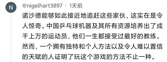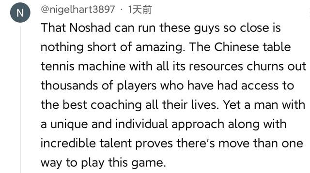 有的外国网友认为中国乒乓球强大,仅仅是因为投入资源多以及努力,这并不完全正确。另外,这位伊朗选手确实打得很好,但这并不意味着他找到了一种有别于中国的乒乓球发展方式,这把他的影响力夸大了。